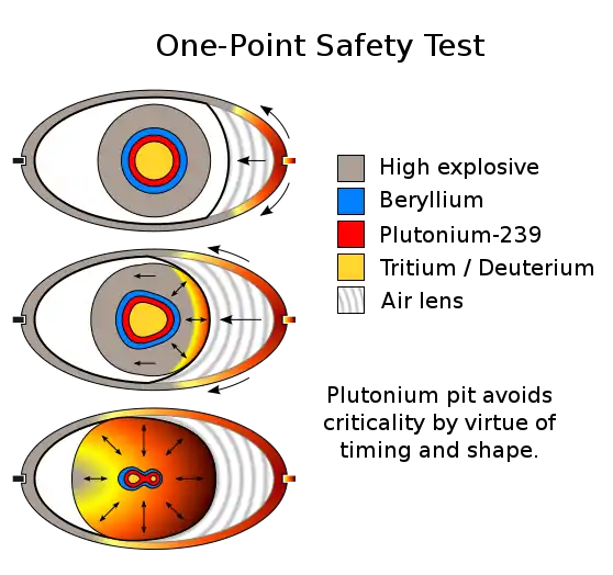Ninguno de estos efectos es probable con las armas de implosión dado que normalmente hay insuficiente material fisible para formar una masa crítica sin la correcta detonación de los lentes. Sin embargo, las primeras armas de implosión tenían pozos tan cercanos a la criticidad que la detonación accidental con algunas potencias nucleares era una preocupación.