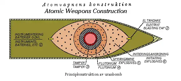 El mecanismo de las lentes de alto explosivo (diagrama item #6) no es mostrado en el diagrama sueco, pero una lente estándar fabricada de altos explosivos lentos y rápidos, como en la Fat Man, sería mucho más larga que lo que muestra la forma. Para que una lente única de alto explosivo genere una onda cóncava que abarque un hemisferio completo, o debe ser muy larga, o la parte de la onda en línea directa entre el detonador y el pozo debe ser demorada drásticamente.