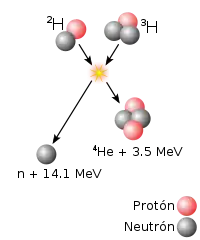 La fusión produce neutrones que disipan energía de la reacción.[8] En las armas, la reacción de fusión más importante es llamada reacción D-T. Usando el calor y la presión de la fisión, hidrógeno-2, o deuterio ( 2D), se fusiona con hidrógeno-3, o tritio ( 3T), para formar helio-4 ( 4He) más un neutrón (n) y energía:[9]
