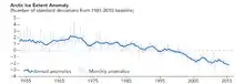 La disminución del hielo marino ártico es la pérdida de hielo marino observada en décadas recientes en el océano Ártico. El Cuarto Reporte de Evaluación del Grupo Intergubernamental de Expertos sobre el Cambio Climático (IPCC) declara que los gases de efecto invernadero son en gran parte, pero no completamente, responsables de la disminución de la extensión del hielo del océano Ártico. Un estudio de 2011 sugirió que la variabilidad interna mejoró la disminución del hielo marino producida por los gases de efecto invernadero en las últimas décadas.[1] Un estudio de 2007 encontró que la disminución ha sido "más rápida de lo que fue predicha" por los modelos de simulación.[2] El Quinto Informe de Evaluación del IPCC concluyó, con alta confiabilidad, que el hielo marino continúa disminuyendo en extensión, y que hay evidencia robusta para la tendencia a la baja en la extensión del hielo marino en el verano ártico desde 1979.[3] Se ha establecido que la región está en su período más cálido por al menos 40,000 años y la temporada de deshielo en todo el Ártico se ha prolongado a razón de 5 días por década (desde 1979 hasta 2013), dominado por una congelación de otoño más tardía.[4] Los cambios del hielo marino han sido identificados como un mecanismo de amplificación polar.[5]