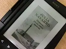 ![]() Portada de la novela de Julia Navarro en un lector de libros electrónicos. | ||
