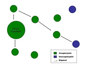 Muchas poblaciones tienen distribuciones espaciales irregulares donde las subpoblaciones separadas pero que interactúan ocupan parches de hábitat discretos (ver metapoblaciones). Los individuos que se dispersan se mueven entre diferentes subpoblaciones, lo que aumenta la conectividad general de la metapoblación y puede reducir el riesgo de extinción estocástica.[25] Si una subpoblación se extingue por casualidad, es más probable que se recolonice si la tasa de dispersión es alta.[26] Una mayor conectividad también puede disminuir el grado de adaptación local.[27]
