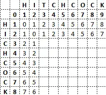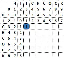 Supongamos que deseamos calcular la distancia entre las cadenas de caracteres (cadena a) HITCHCOCK y (cadena b) HICHCOCK.