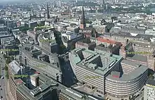 Desde el siglo XVII, la zona está densamente edificada; el resultado fue el llamado Gängeviertel ("barrio de los corredores"), con muchas callejuelas estrechas. La densidad de los edificios aumentó aún más cuando hubo escasez de viviendas tras el incendio de Hamburgo de 1842. En 1892 estalló una epidemia de cólera y las malas condiciones higiénicas del barrio hicieron que la enfermedad se extendiera drásticamente, por lo que se decidió reurbanizar la zona: [2] : 29 Como resultado, muchos habitantes fueron reasentados.[3] [4]