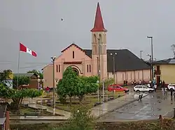 ![]() Vista de la plaza Mayor de Las Pirias, la capital distrital, con la iglesia de la Sagrada Familia al fondo.