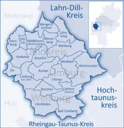 El actual distrito de Limburg-Weilburg nació en 1974 fruto de la reorganización administrativa del estado federal de Hesse.