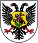 En plata un águila doble con uñas y lengua rojas con escudo dorado sobre su pecho. En él San Jorge con armadura de plata matando un dragón.