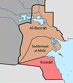 Mientras que el resto de Kuwait fue anexado como la decimonovena gobernación de Irak , las partes estratégicas del norte de Kuwait fueron anexadas como el distrito de Saddamiyat al-Mitla como parte de la gobernación de Basora.