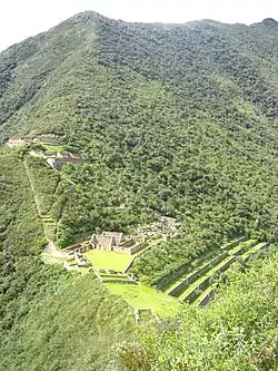 - Choquequirao (del quechua chuqi, oro, y de k'iraw, cuna, es decir: "cuna de oro"),[8] son los restos arqueológicos de una ciudad inca situada entre las estribaciones del nevado Salcantay, y bajo la jurisdicción del Distrito de Santa Teresa, Provincia de La Convención, Departamento del Cuzco, al sur del Perú.[9]El entorno de Choquequirao es uno de los más ricos en biodiversidad. Todas estas especies se han acondicionado a pesar de las variaciones de temperatura como es sol durante todo el día e inclementes heladas durante la noche. La fauna del lugar está compuesta principalmente por cóndores, tarucas, vizcachas, zorros, zorrinos, pumas, picaflores, osos y el gallito de las rocas, ave nacional del Perú. En su flora destacan los helechos gigantes, el ichu y una gran variedad de orquídeas, donde resalta la de la variedad wakanki.[10]