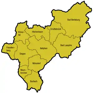 Los municipios de Erndtebrück así como Bad Berleburg y Bad Laasphe pertenecen al Wittgensteiner Land y proceden del antiguo distrito de Wittgenstein, las otras ciudades y municipios (Gemeinden) pertenecen a la región de Siegerland y radican en el antiguo distrito de Altkreis Siegen.