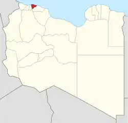 El distrito orillas en la costa mediterránea al norte (Golfo de Trípoli). En tierra, linda con los distritos de Zauiya al oeste, Al Jfara al suroeste, Al Jabal al Gharbi al sur y Al Murgub al este.