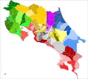 ![]() Cantones y distritos de Costa Rica. Cada color indica el territorio de una provincia, y las tonalidades los cantones. | ||