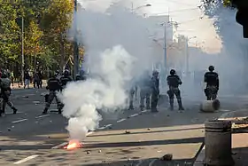 Los manifestantes antigais se enfrentaron a 5000 policías antidisturbios armados[3] lanzando cócteles mólotov, ladrillos, piedras, botellas de cristal y petardos;[4] la policía empleó gases lacrimógenos y balas de goma.[2] No hubo muertes.[2]