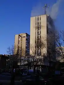 El humo denso fue causado por la quema de varios coches de policía cerca del edificio presidencial de Bosnia y Herzegovina, el cual también sufrió severos daños cuando los manifestantes prendieron fuego a varias secciones de los archivos estatales, localizado en esa misma parte.[19][50] Los manifestantes también quemaron y apedrearon el edificio de la municipalidad de Centar, así como la sede del gobierno regional del Cantón de Sarajevo.[19]