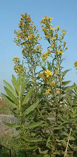 - Dittrichia viscosa (L.) Greuter, Exsicc. Genav. 4: 71, 1973 y sus 3 subespecies, anteriormente consideradas como especies[3] (Dittrichia viscosa subsp. angustifolia (Bég.) Greuter, Dittrichia viscosa subsp. maritima (Brullo & De Marco) Greuter, Dittrichia viscosa subsp. revoluta (Hoffmanns. & Link) P.Silva & Tutin).[11]