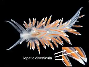Los animales individuales dentro del clado nudibranquio <i>Aeolidida</i> tienen una serie de estructuras largas que sobresalen llamadas <i>cerata</i> en su superficie dorsal. Dentro de los cerata de estos nudibranquios se encuentran los divertículos hepáticos, que son una excrecencia de la glándula digestiva o hepatopáncreas del animal. Las cerata son translúcidas, por lo que el contenido de los divertículos es fácilmente visible desde el exterior del animal. Debido a esto, un nudibranquio eólido adquiere automáticamente el color de cualquier sustrato y fuente de alimento en el que vive y se alimenta (por ejemplo, anémonas de mar o hidroides). Visualmente, el animal se camufla cuando está en su fuente de alimento. Los divertículos también tienen otro propósito importante porque transmiten a las puntas de las cerata los nematocistos intactos que se han ingerido de la fuente de alimento. Estas células urticantes sirven para defender al nudibranquio contra la depredación.[4][5]