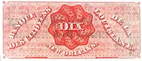 - La palabra "Dixie" se refiere a la moneda emitida por los Banco Estatal de los Ciudadanos en el Barrio francés de Nueva Orleans y, a continuación, por otros bancos en Louisiana.[15] Estos bancos emitieron billetes de diez dólares [16] con la etiqueta Dix en el reverso, el término francés para "diez". Las notas eran conocidas como "Dixies" por los sureños, y el área alrededor de Nueva Orleans y el área de habla francesa partes de Louisiana llegó a ser conocido como "Dixieland". Finalmente, el uso del término se amplió para referirse a los estados del Sur en general.
