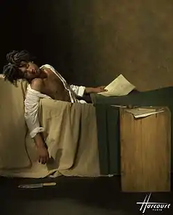 ![]() Pastiche del cuadro Muerte de Marat, con Doc Gynéco en el papel de Jean-Paul Marat. | ||