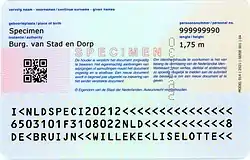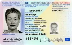 ![]() ![]() Anverso y reverso de ejemplar del documento de identidad neerlandés del tamaño de una tarjeta de crédito emitido desde el 9 de marzo de 2014. | ||