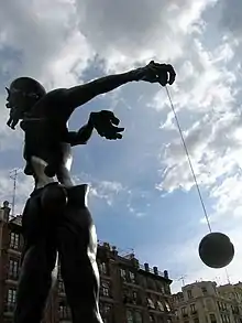La escultura representa una figura masculina realizada en bronce patinado en negro, que se asienta sobre un pedestal cúbico de granito negro pulido. El modelo elegido por Dalí para la figura consistió en una adaptación de la escultura realizada en 1969 titulada Homenaje a Newton, a su vez basada en una pequeña imagen representada en la obra pictórica Fosfene de Laporte, de 1932. La figura masculina presenta el cuerpo en actitud de movimiento, representado por su tensión en las piernas y su pie izquierdo levantado por la zona posterior del talón, apoyando todo su peso sobre el pie derecho, que se muestra seccionado en tres fragmentos; junto a él, otro fragmento de dedo suelto. La parte del cuerpo por encima de su cintura está horadada, creando un espacio vacío del cual pende en su interior una esfera. En la parte posterior se diseña una cadena de pequeñas bolas semejando una columna vertebral. La cabeza de la escultura está también horadada en la zona del rostro y muestra una leve cabellera movida por el viento. Los brazos se extienden hacia su derecha, forzando su brazo izquierdo hasta situarlos en paralelo. De su brazo derecho cuelga una esfera suspendida de un fino hilo, la cual originalmente estaba realizada en granito negro, según se estipulaba en el acuerdo entre Salvador Dalí y el Ayuntamiento, con fecha 12 de noviembre de 1985.