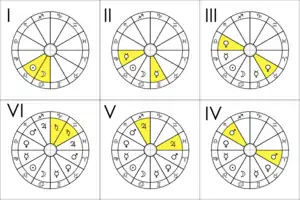 Dado que Mercurio nunca luce más de un signo lejos del Sol en ambas direcciones, se destinaba a gobernar los dos signos contiguos a Leo y Cáncer (Virgo y Géminis), y, así pues, dado que Venus nunca puede lucir más de dos signos lejos del Sol, obtenía el mando de Libra y Tauro.
