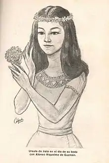 - ) Con la guaraní Águeda[17] tuvieron a la mestiza Isabel de Irala[17] que se unió en matrimonio con el conquistador Pedro de la Puente Hurtado[17] y con quien concibiera al futuro gobernador interino Pedro Hurtado de Mendoza.[17]