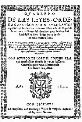 Cabe señalar que entre marzo y agosto de 1637 se celebraron cortes del Reino, también en Pamplona, cuyas resoluciones no se debieron de imprimir, toda vez que no se conoce un solo ejemplar referido a esta convocatoria.