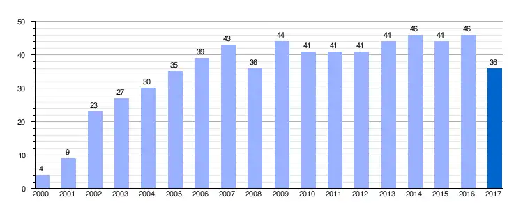 Gráfica de evolución demográfica de Dordóniz entre 2000 y 2017 |