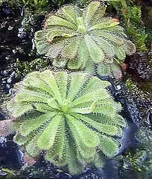 Drosera: tanto su nombre científico –derivado del griego δρόσος [drosos]: "rocío, gotas de rocío"– como el nombre vulgar –rocío del sol, que deriva del latín ros solis: "rocío del sol"– hacen referencia a las brillantes gotas de mucílago que aparecen en el extremo de cada hoja, y que recuerdan al rocío de la mañana.