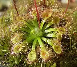 Drosera: tanto su nombre científico –derivado del griego δρόσος (drosos): "rocío, gotas de rocío"– como el nombre vulgar –rocío del sol, que deriva del latín ros solis: "rocío del sol"– hacen referencia a las brillantes gotas de mucílago que aparecen en el extremo de cada hoja, y que recuerdan al rocío de la mañana.