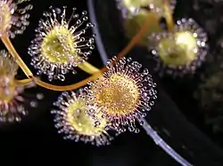 Drosera: tanto su nombre científico –derivado del griego δρόσος (drosos): "rocío, gotas de rocío"– como el nombre vulgar –rocío del sol, que deriva del latín ros solis: "rocío del sol"– hacen referencia a las brillantes gotas de mucílago que aparecen en el extremo de cada hoja, y que recuerdan al rocío de la mañana.