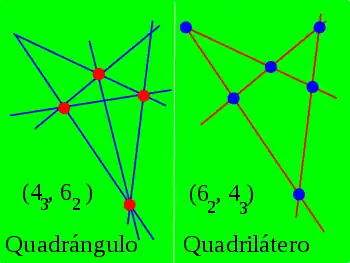 Un conjunto de m puntos y de n rectas se denomina (mc, nd) configuración si c las n rectas pasan por cada punto y d de los m puntos se encuentran en cada recta. El dual de una configuración (mc, nd), es una configuración (nd, mc). Por lo tanto, el dual de un cuadrángulo, una configuración (43, 62) de cuatro puntos y seis rectas, es un cuadrilátero, una configuración (62, 43) de seis puntos y cuatro rectas.[4]