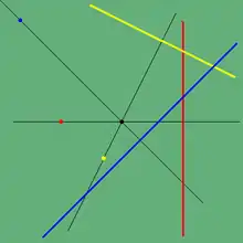 Para convertir este proceso en una correlación, el plano euclidiano (que no es un plano proyectivo) necesita expandirse al plano euclideo extendido agregando una recta del infinito y un punto del infinito que se encuentra en esta recta. En este plano expandido, se define la polar del punto O como la recta del infinito (y O es el polo de la recta en el infinito), y los polos de las rectas a través de O son los puntos del infinito donde, si una recta tiene pendiente s (≠ 0) su polo es el punto del infinito asociado a la clase de rectas paralelas con pendiente −1/s. El polo del eje x es el punto del infinito de las rectas verticales y el polo del eje y es el punto del infinito de las rectas horizontales.