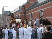 La primera mención de una procesión se remonta al 1399. En efecto, es en esta fecha que se encuentra, en las cuentas de la massarderie, la mención del pago de un cierto número de personas para hacer pasar a los peregrinos, con objeto de rehacer los caminos o para retirar la basura una vez terminadas las ceremonias.[6] En el segundo cuarto del siglo XV, aparecen grupos figurativos en la antigua procesión parroquial de San Julián. El historiador ateniense Emmanuel Fourdin sitúa este surgimiento alrededor de 1430.[7] Las cuentas de 1431-1432 incluyen, de hecho, un pago de cuatro libros a compañeros que representan las vidas de varios santos y mártires.[8] En 1462, el número de «historias» se multiplicó enormemente: se necesitaron 41 pares de caballos,[9] para tirar de los carros en los que se representaba la mayoría de ellos. Pero el acontecimiento del año fue el nacimiento del caballo Bayard y de Los cuatro hijos de Aymón, creados para «reverenciar la mencionada procesión y la boine ville».[10] El caballo está copiado del de Oudenaarde donde los enviados fueron a aprender sobre su construcción y manejo. Portado por un equipo de diez o doce hombres, dependiendo del año, el caballo es enorme. Fue una suscripción pública que reportó más de 39 «libras de tournois» que cubría el costo de su construcción y equipamiento.[9] El mismo año, se menciona a un san Cristóbal.