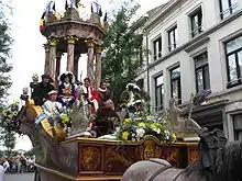No es posible, en el estado actual de conocimiento, tener una idea de en qué se convirtió esta procesión en los siglos XVI y XVII. Fourdin,[14] afirma que creció en tamaño entre 1450 y 1550, pero que disminuyó en la segunda mitad del siglo XVI tan rápidamente como había florecido. La primera de estas afirmaciones no está apoyada por ningún argumento. La segunda, en cambio, se basa en el desastroso estado de las finanzas municipales, totalmente arruinadas por los innumerables subsidios, impuestos y requisas, en las guerras y en la peste, por último, que hizo estragos casi continuamente desde 1578 hasta 1599.[15] De hecho, la procesión fue financiada por la comuna, la parroquia y las hermandades. Sin embargo, en 1589, se gastaron 136 libras en un suntuoso banquete que reunió a la condesa de Beaurieu, acompañada por el barón Carlos I de Trazegnies, los señores Dandelot y d'Ayseau «que vinieron a representar las historias el día de la procesión en la casa de eschevinalle, donde mi señor el conde de Egmont también vino con la señora, el señor de Marchenelle y varios caballeros de su suytte».[16] Por lo tanto, la procesión tuvo siempre una cierta pompa y circunstancia. En 1647, el magistrado concedió cien libras a los ballesteros «como un adelanto de su Goliat, que afirmaron hacer nuevo, considerando que servía de adorno a la procesión».[17] Es, además, probable que el carro de la Iglesia triunfante, inspirado en la Contrarreforma, sea de este período.