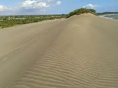 En las dunas, como árboles de anclaje o fijación, se encuentran el aceituno (Simarouba berteroana) - endémico de esta región - y el cambrón (Acacia macracantha). Otras especies presentes son la cotinilla (Metopium toxiferuna), guao (Comocladia dentata), uva de playa (Coccoloba uvifera), saona cimarrona (Ziziphus reticulata). Los cactus están representados por la alpargata (Consolea moniliformis), tuna brava (Opuntia dillenii), guasábara (Cylindropuntia caribaea), guasábara pilotera (Opuntia antillana), yaso (Harrisia nashii), cayucos (Lemairecereus hystrix y Pilocereus polygonus), el melón espinoso (Melocactus lemairei) y el bombillito (Mammillaria prolifera).
