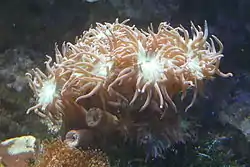 Sus grandes pólipos tienen tentáculos con coloraciones que van del gris al verde pálido, rosa o púrpura; con el disco oral generalmente de color azul o verde. El tamaño de los pólipos puede alcanzar 4,5 cm de diámetro.
