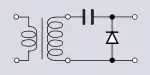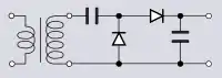 El circuito de Villard, nombrado en honor a Paul Ulrich Villard,[p 1] consiste únicamente en un condensador y un diodo. Si bien el circuito posee el beneficio de ser simple, el voltaje de salida presenta un rizado pobre. Este circuito es esencialmente un clamper de diodos. El condensador se carga en los semiciclos negativos del voltaje de CA (Vp). La salida es la superposición del voltaje alterno de entrada y el voltaje continuo del condensador. Los picos negativos de la forma de onda de CA se fijan a 0 V (en realidad, se fijan a la pequeña tensión del diodo −VF) gracias al diodo, por lo que los picos positivos de la tensión de salida es la suma del voltaje Vp y del condensador, lo que resulta en 2Vp. El rizado pico a pico resultante es de 2Vp y no se puede suavizar a menos que se adapte el circuito a una forma de duplicador más sofisticada.[1]