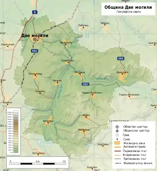 La comunidad de municipios de Dve Mogili está situada en la parte oriental de la llanura montañosa del Danubio, y tiene una superficie de 345 km². Ocupa el 13.1% del territorio de la provincia de Ruse. La ciudad de Dve Mogili es el centro administrativo de dicha comunidad e incluye las doce poblaciones siguientes: