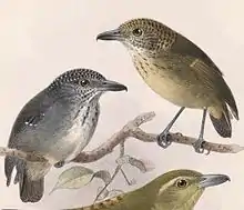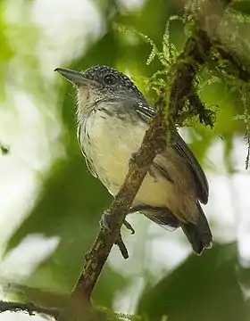 ![]() Ejemplar hembra de batarito coronipunteado (Dysithamnus puncticeps) en Panamá. | ||