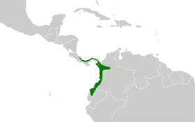 Se distribuye desde el sureste de Costa Rica (Limón), Panamá (pendiente del Caribe, también en la pendiente del Pacífico en el extremo este de Panamá y Darién), oeste de Colombia (pendiente del Pacífico, y en el bajo valle del Cauca en Antioquia) y noroeste de Ecuador (hacia el sur hasta Los Ríos y Manabí).[4]