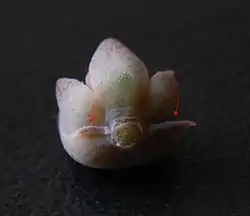 ![]() Vista de las dos bracteloas (flechas rojas) características de la sección Racemosae en una flor de E. racemosa var. racemosa. | ||