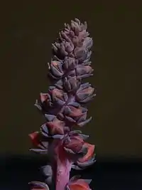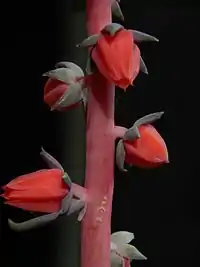 La inflorescencia es un tallo erecto de 50 cm, con 17 a 50 flores cónicas rojizas o anaranjadas.[2]