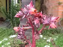 La inflorescencia es una panícula ramificada, rojiza, leñosa al secarse, que puede medir más de un metro de altura. Las flores tienen una corola pentagonal tubular o conoide y pétalos color rosado a anaranjado. Florece en otoño (septiembre a diciembre).[2]