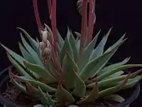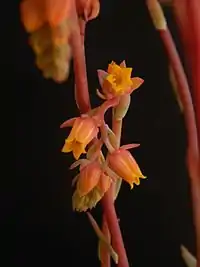 La inflorescencia es un tallo erecto de hasta 21 cm, de color rojizo a verde amarillento, con 2 a 14 flores cónicas amarillas o anaranjadas.[1]