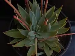 Es una planta herbácea, perenne, glabra y acaule. Crece en forma de roseta compacta de 4 a 17 cm de diámetro, con hojas carnosas oblongo-lanceoladas de color verde azuloso, de margen entero, rojizo, y ápice acuminado.