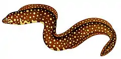 Echidna xanthospilos es una especie de peces de la familia de los morénidas en el orden de los Anguilliformes.