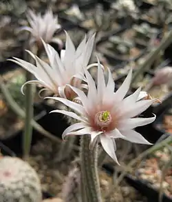 Es una biznaga de la familia Cactaceae del orden Caryophyllales. Es descrita como una planta arbustiva ramificada; presenta raíces fasciculado-tuberosas; sus tallos son cilíndricos, hasta de 30 cm de alto y 3 a 6 mm de diámetro, verde-púrpuras; presenta 8 costillas oblicuas. La forma de las areolas es orbicular; las espinas radiales van de 9 a 18, aciculares, divergentes, blancas; espinas centrales 2 a 3, morenas o negras en su mitad superior. Flores infundibuliformes, de 2 a 4 cm de largo, hasta 4 cm de diámetro, blancas, surgen desde el ápice de los tallos hasta la mitad de los mismos. Fruto ovoide, espinoso, verde oliva y pulpa blanca. Semillas orbiculares, tuberculadas, pardo-negruzcas.[3][4]