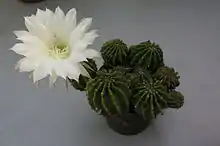 Cactus de cuerpo globular de color verde claro a medio. Posee 12 a 13 costillas, areolas con 6 a 7 fuertes espinas radiales y una central. Las grandes flores de color blanco poseen un largo tubo floral característico de este género.
