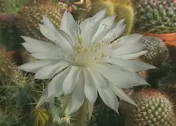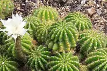 Es una planta perenne que crece solitaria o formando grupos. Tiene forma de bola, de color verde oscuro a verde pálido con brotes que alcanzan los 6-9 cm de diámetro. Tiene de 13 a 16 grandes costillas , que son casi muescas. Las areolas están empotradas y miden hasta 1.5 cm, de ellas florecen esponas aciculares de color amarillo. Las tres espinas centrales son ligeramente más largas que las 14 a 20 espinas radiales. Las espinas son de hasta 1 cm de largo. Las flores son blancas en forma de embudo y aparecen al lado y se abren por la noche. Son de hasta 16 centímetros de largo.